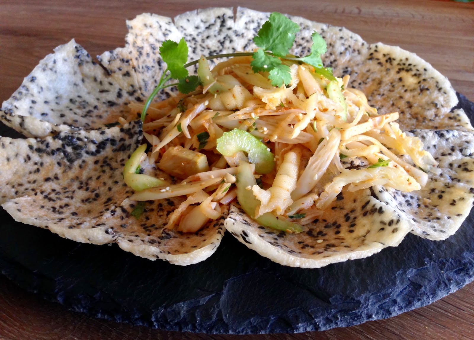 Ăn gỏi mít non không thể thiếu bánh tráng nướng cùng chén nước mắm chanh tỏi ớt. Bẻ miếng bánh tráng, xúc một ít gỏi, chấm vào chén nước mắm và thưởng thức bánh tráng giòn rụm, mít non ngọt, bùi như thịt gà, các vị cay, mặn, ngọt hòa lẫn vào nhau làm cho món ăn thêm phần đậm đà và thi vị.