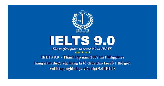IELTS 9.0 – Du học Philippines tại Việt Nam. IELTS 9.0 đứng số 1 thế giới trong danh sách những cơ sở đào tạo IELTS tại Philippines IELTS 9.0 đoạt trên 50 giải thưởng là nơi đào tạo IELTS số 1 thế giới do BC và IDP trao tặng hàng năm tại Philippines kể từ năm 2007 đến nay với hầu hết học viên đều đạt từ 7.0 IELTS++, và hàng nghìn học viên đạt 8.0-9.0