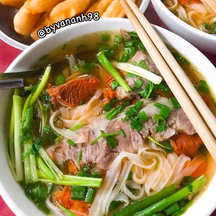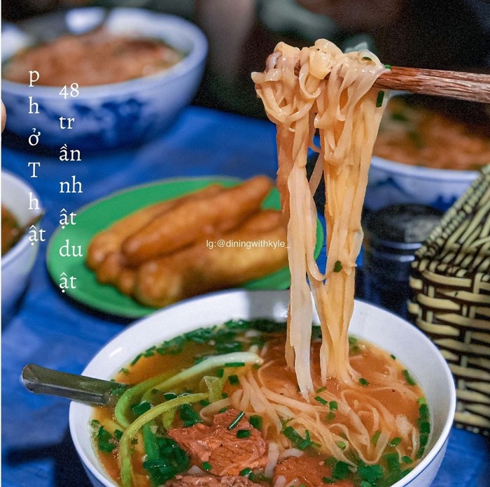 Ỏ phở Thật, bánh phở rất mềm, thịt bò được thái miếng khá to, nước lèo sóng sánh, màu vàng vàng nâu nâu siêu hấp dẫn. Khi ăn, bạn cho chút hành, chanh, ớt và quẩy nữa thì ngon khỏi bàn.