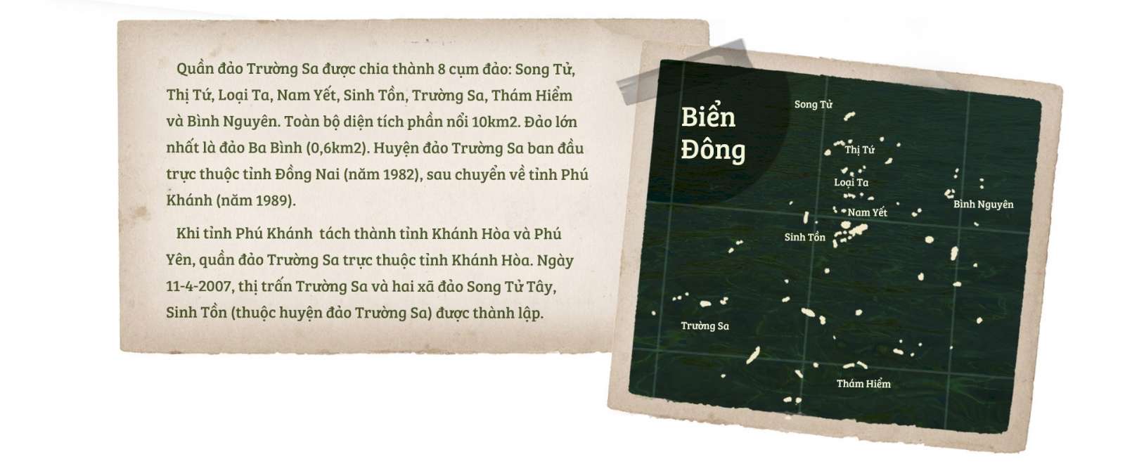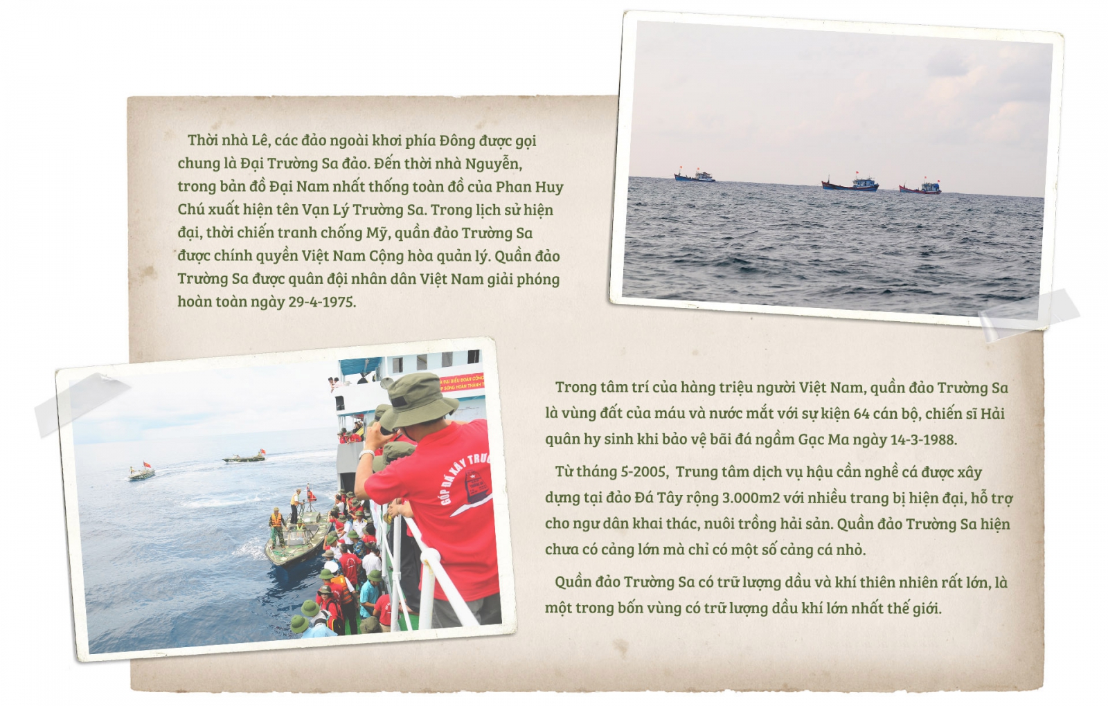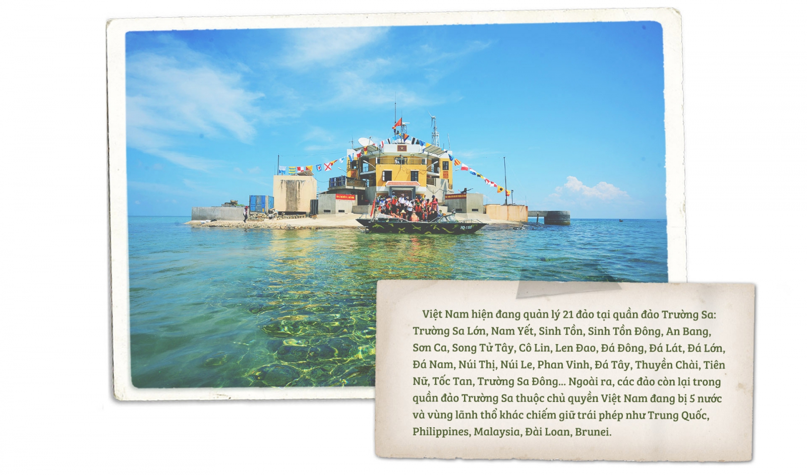 Quần đảo Trường Sa không còn là những đảo nhỏ cô đơn giữa mênh mông biển khơi, nơi chỉ có sóng gió, bão giông. Trường Sa ngày nay như một thành phố nhỏ trên Biển Đông, với những khu dân cư, những làng chài ven đảo. Thị trấn có diện tích 0,15 km2, dài 630m, nơi rộng nhất 300m, không khác gì đất liền: có đường nhựa, có trường học, bệnh xá khang trang hiện đại và có cả chùa, có đường băng cho máy bay cất hạ cánh....