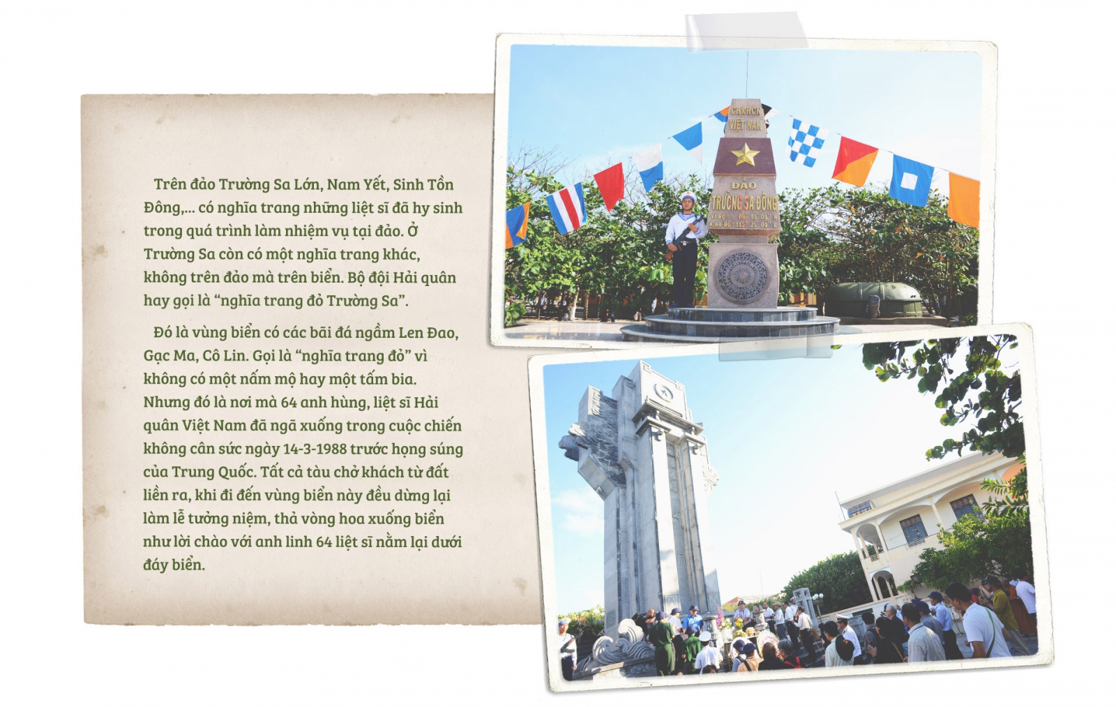Bên kia không xa, có thể nhìn bằng mắt thường là những tòa nhà to cao kiên cố, hoành tráng lừng lững của Trung Quốc đang chiếm đóng trái phép. Ra đảo, sẽ được nghe kể về những lần căng thẳng khi bên kia chĩa súng ống vào bên này bộ đội mình để thị uy, đe dọa, “nắn gân”. Những lúc ấy, toàn đảo đặt trong tình trạng báo động sẵn sàng chiến đấu. Căng thẳng cũng là một hình thức “tra tấn”, nhưng cũng là thước đo độ bản lĩnh, kiên cường, vững vàng của mỗi người lính nơi đảo xa này.